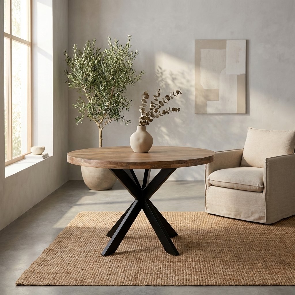 Eetkamertafel Vicenzo rond 110cm van BLenS-furniture is een compacte, stijlvolle eettafel die bewijst dat groots genieten helemaal niet groot hoeft te zijn. Deze ronde eettafel is vervaardigd uit massief mangohout en straalt warmte, karakter en een vleugje stoer design uit, perfect voor elke moderne, industriële of landelijke eetkamer.
