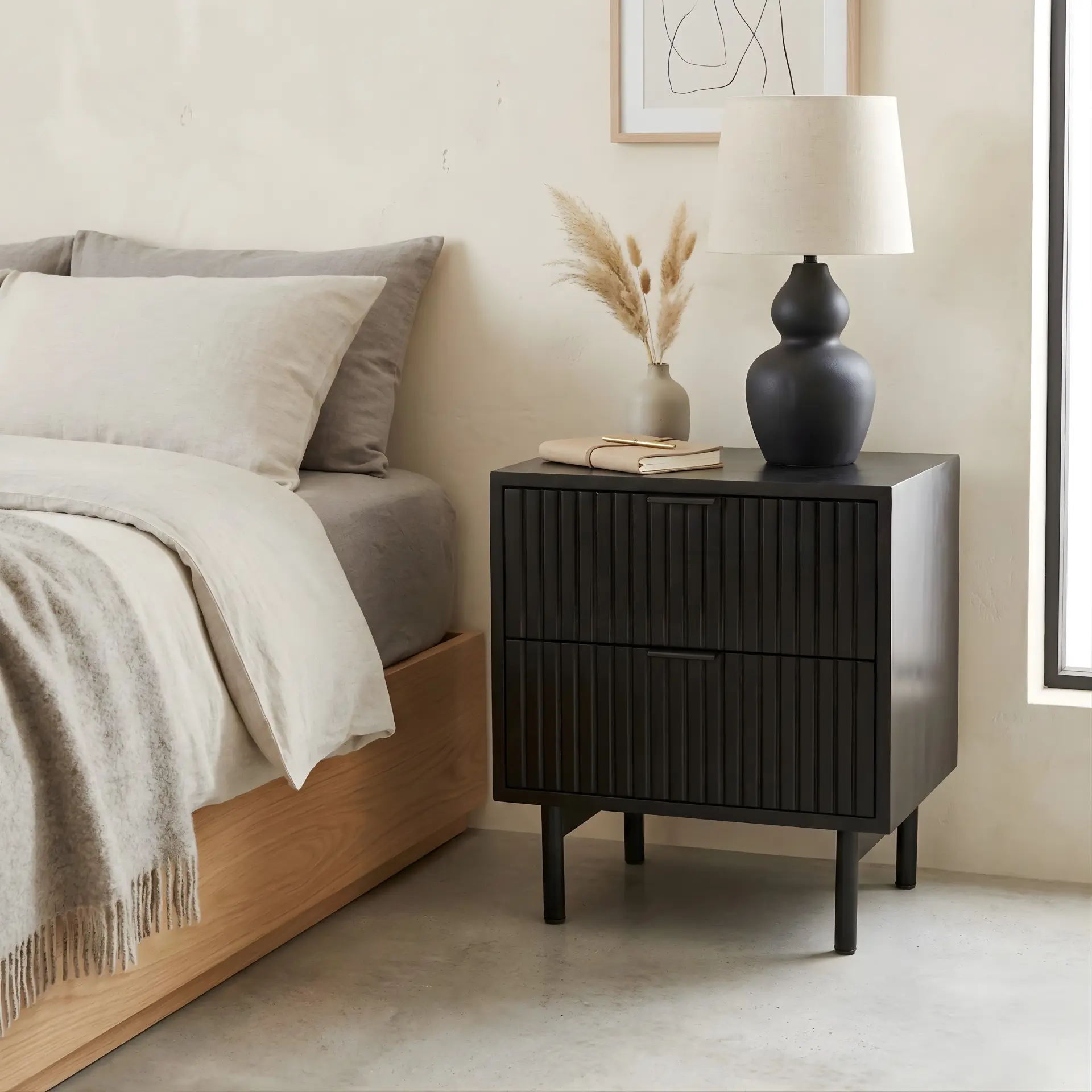 Dit volledig zwarte nachtkastje heeft een afmeting van 50cm breed, 40cm diep en 55cm hoog heeft veel opbergruimte dankzij de twee grote lade.