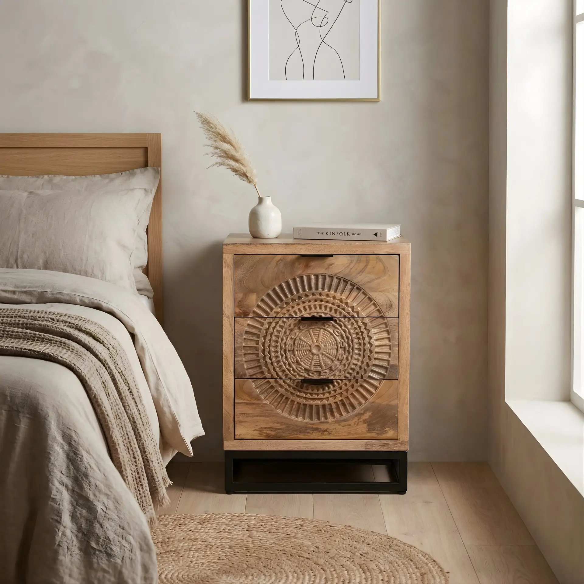 Nachtkastje Morada naturel van BLenS-Furniture is een nachtkastje met fraai houtsnijwerk van mangohout.