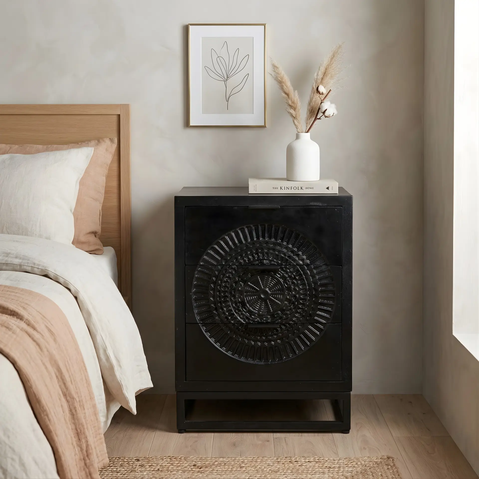 Nachtkastje Morada zwart van BLenS-Furniture is een nachtkastje met fraai houtsnijwerk van mangohout.