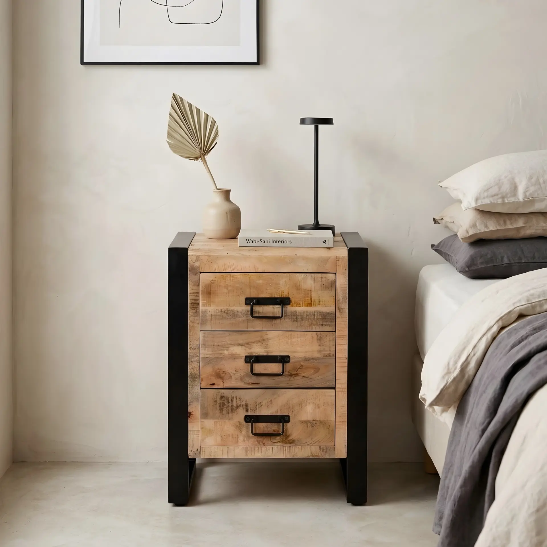 Dit nachtkastje heeft een afmeting van 50cm breed, 40cm diep en 65cm hoog heeft veel opbergruimte dankzij de 3 grote lades. Om het massieve mangohout te beschermen tegen vocht, vuil en kringen is het eerst gezandstraald, vervolgens behandeld met verfbeits en afgewerkt met een natuurlijke bijenwas. Het frame en de handgrepen zijn gemaakt van staal en afgewerkt met een poedercoating. Dit nachtkastje wordt volledig gemonteerd geleverd en kan direct op de gewenste plek worden geplaatst.