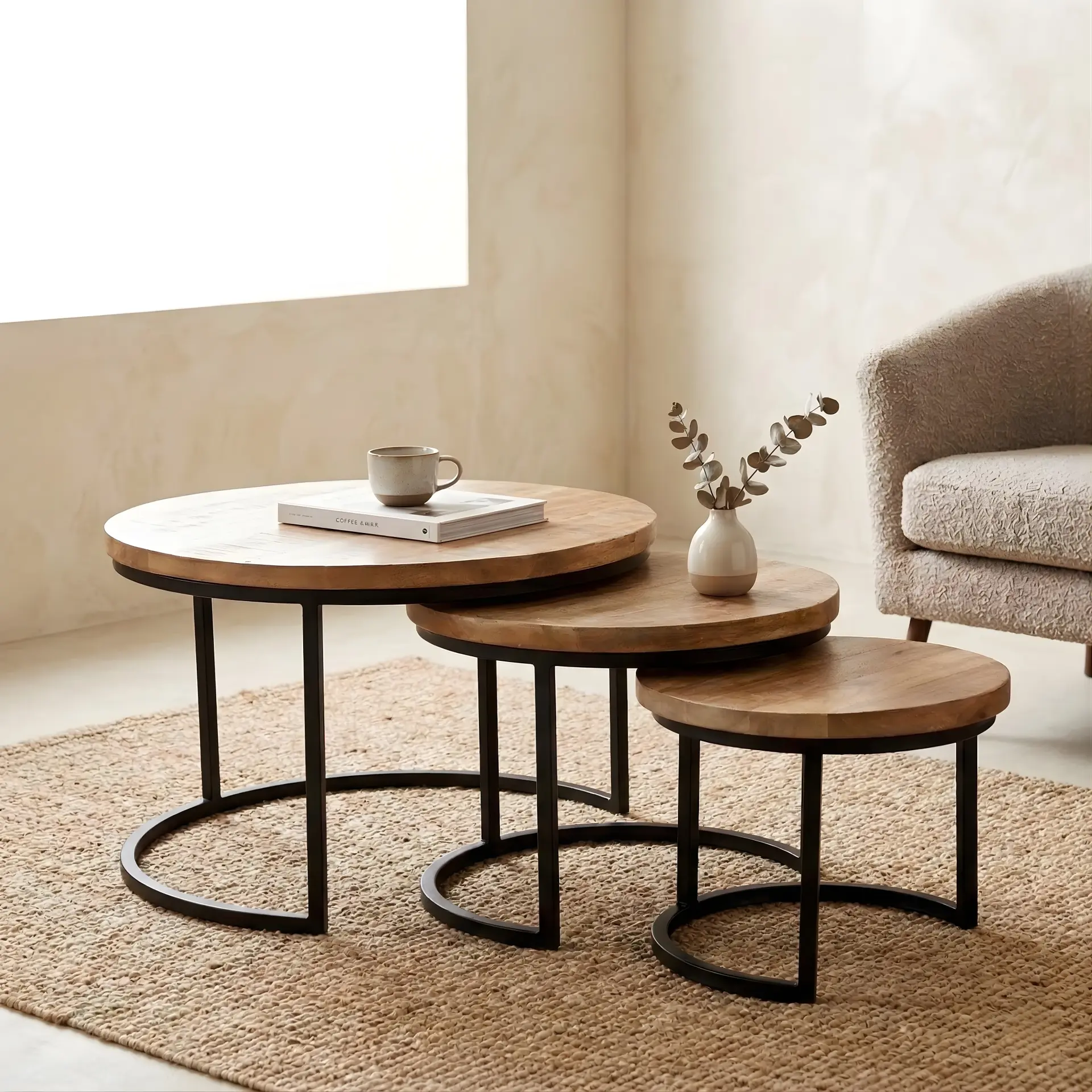 Deze salontafelset biedt genoeg oppervlakte voor drankjes, boeken of planten, terwijl de nesting-functionaliteit je helpt ruimte te besparen wanneer dat nodig is. De combinatie van hout en metaal maakt deze tafels een blikvanger in zowel moderne, industriële als Scandinavische interieurs.