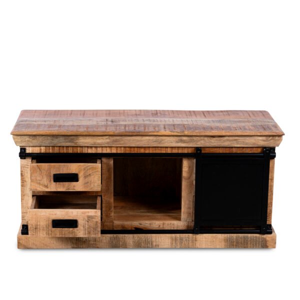 Dit tv meubel met een afmeting van 140cm breed, 45cm diep en 55cm hoog is robuust gebouwd en heeft een rustieke uitstraling door de houtnerf. De kast bestaat uit 4-laden, 1 dichte metalen deuren die naar links of rechts weggeschoven kan worden.