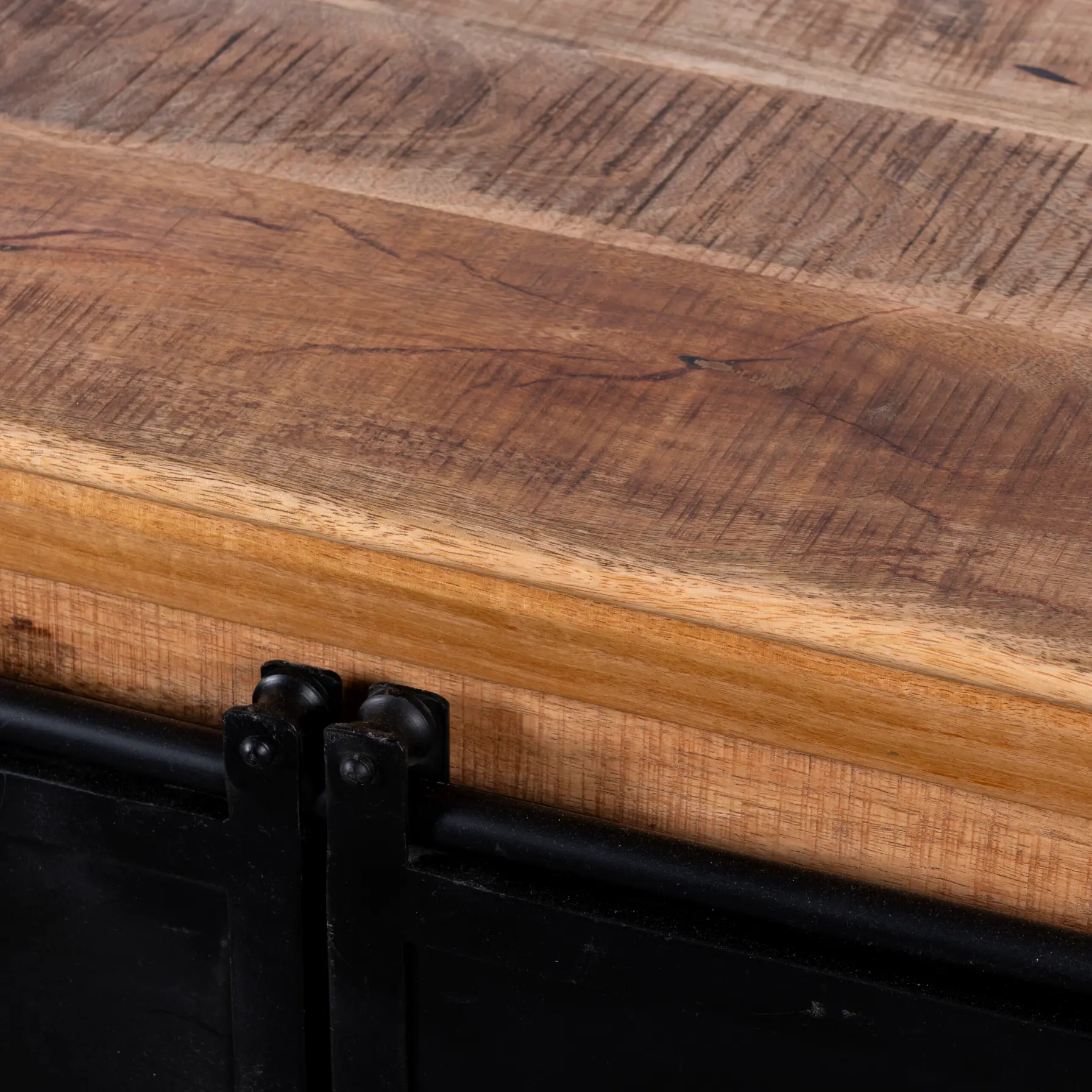 Dit tv meubel met een afmeting van 180cm breed, 45cm diep en 55cm hoog is robuust gebouwd en heeft een rustieke uitstraling door de houtnerf. De kast bestaat uit 4-laden, 1 dichte metalen deuren die naar links of rechts weggeschoven kan worden.