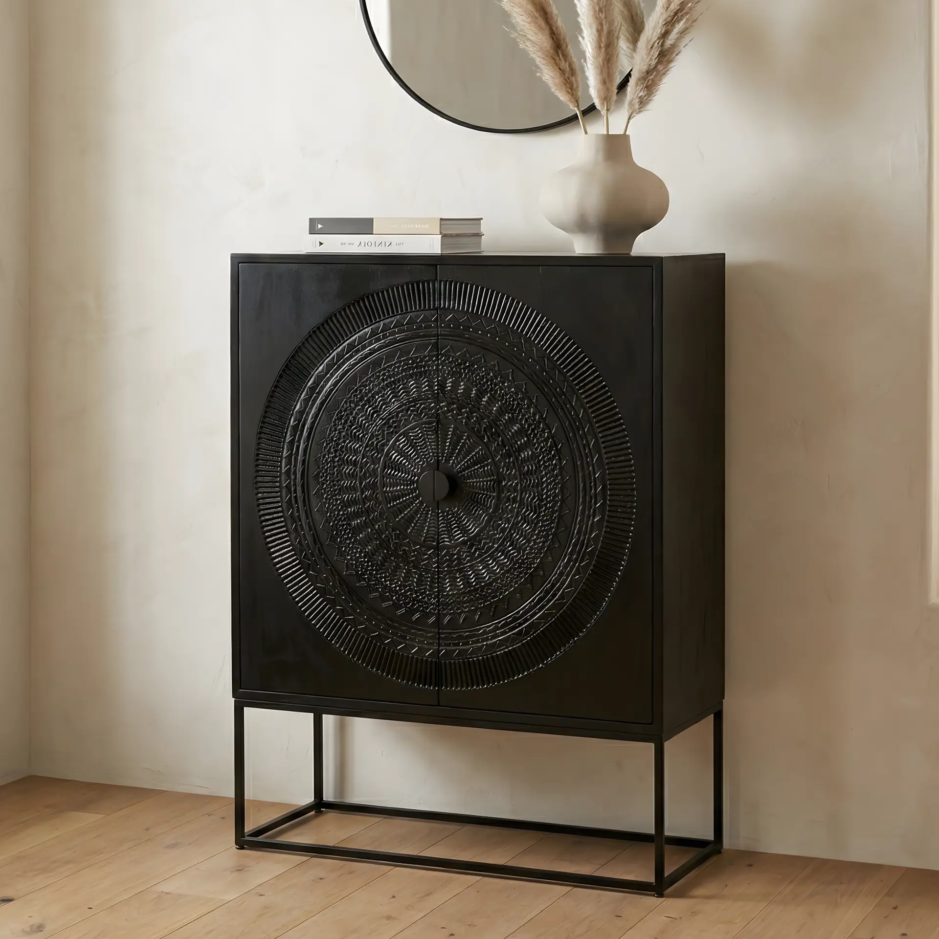 Wandkast Morada large zwart van BLenS-Furniture is een wandkast met fraai houtsnijwerk van mangohout.