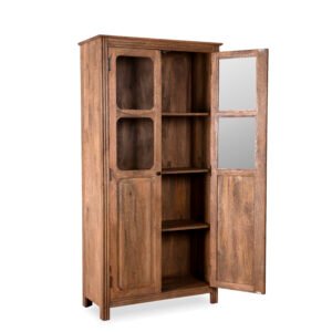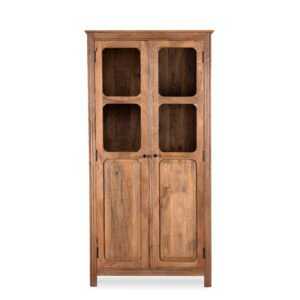 Deze kast met een afmeting van 90cm breed, 40cm diep en 180cm hoog heeft opbergruimte achter het dichte deel van de deurtjes en een mooie presentatie ruimte achter het glas deel van de deurtjes.